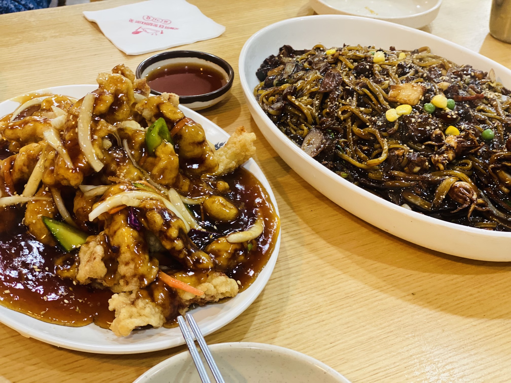저희는 아침을 조금 늦게 먹어서 3명이서 해물쟁반짜장(2인)과 탕수육(소)을 시켰는데요.