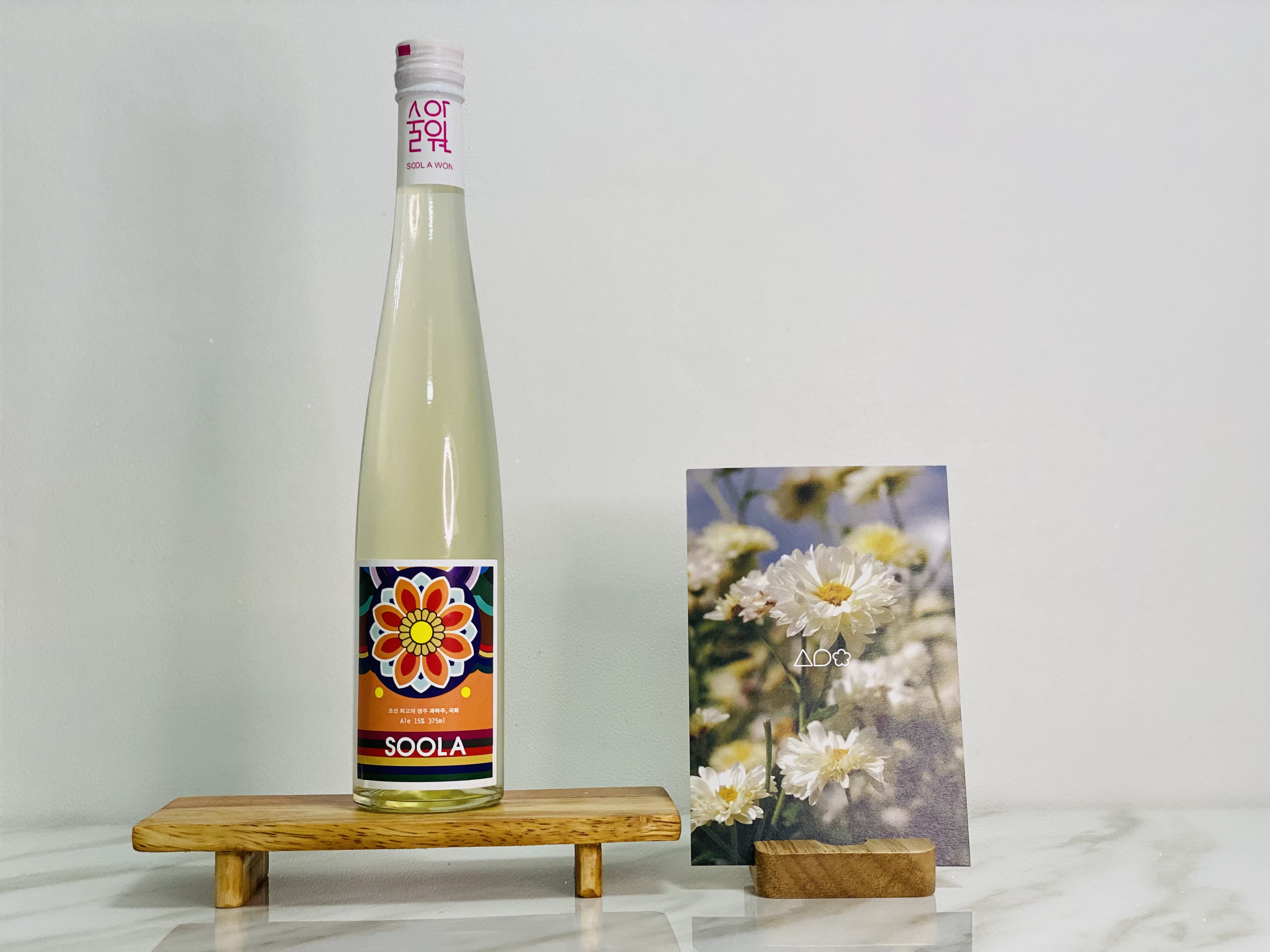 그다음 국화꽃을 넣어 숙성하고 여과까지 거치게 되면 맑은 「술아 국화주」가 만들어집니다.