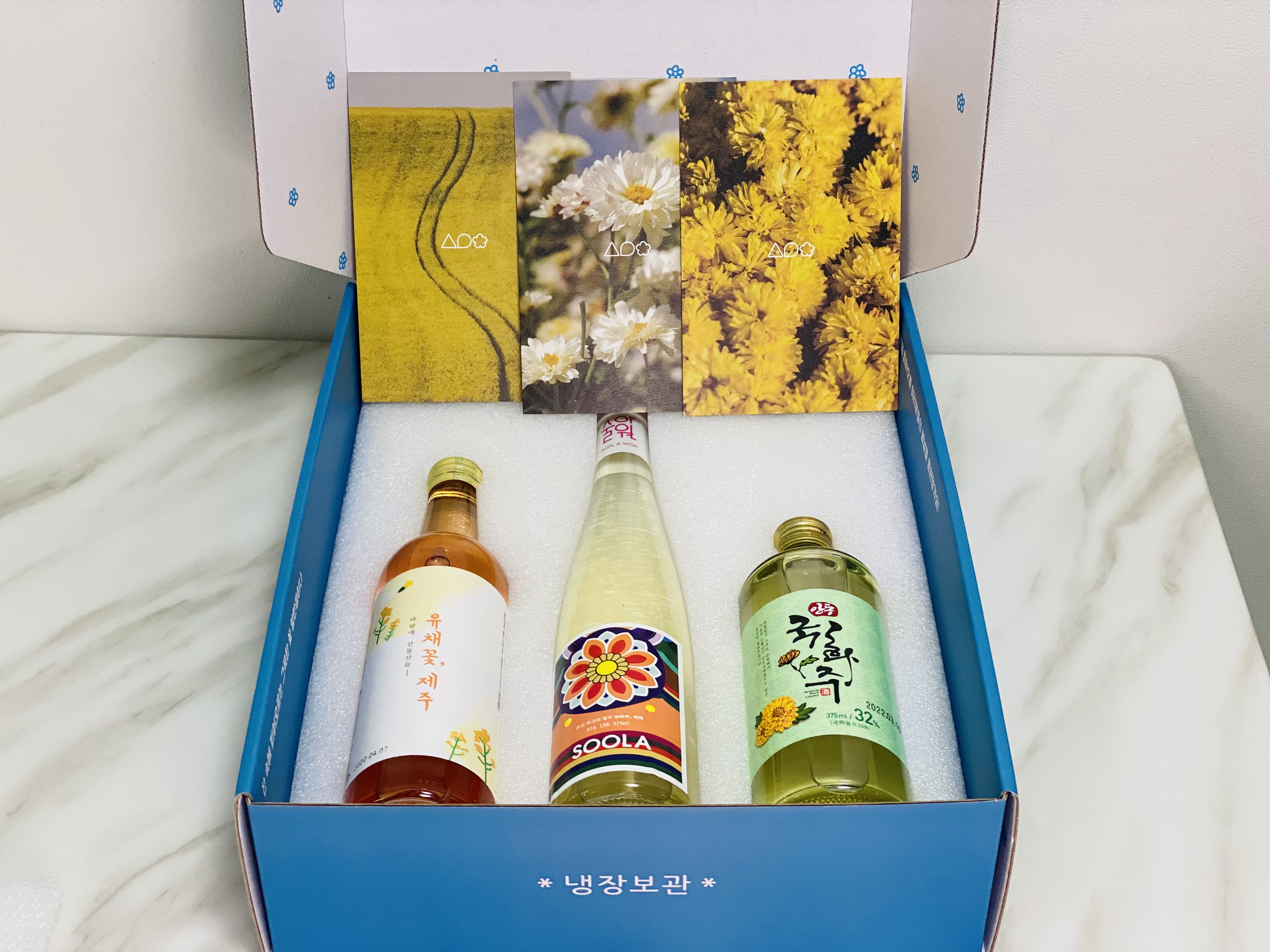 22년 3월은 유채꽃, 제주 365ml + 술아 국화주 375ml + 안동국화주 32 375ml + 각 술의 큐레이트 카드입니다.