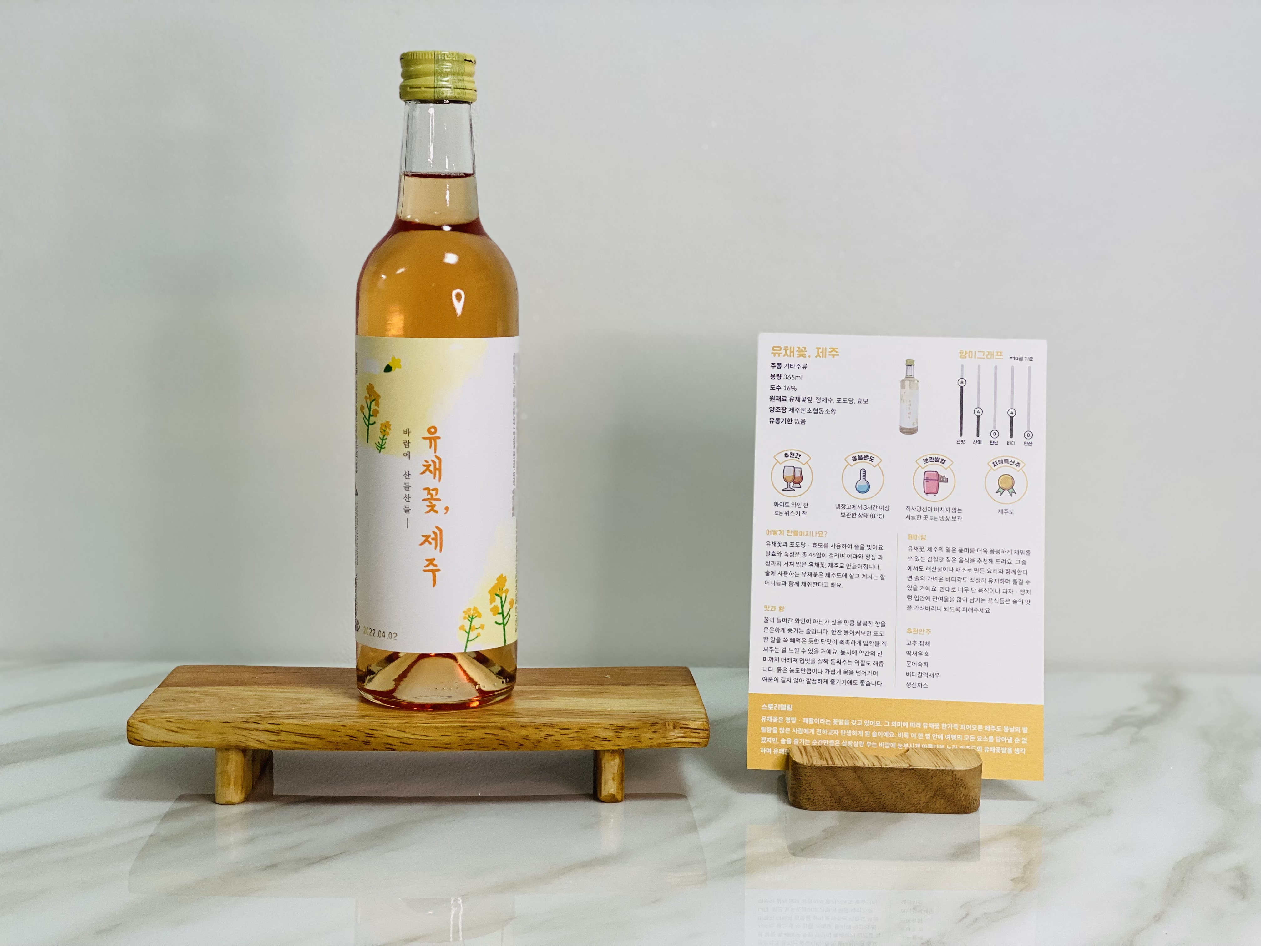 비록 이 한 병 안에 여행의 모든 요소를 담아낼 순 없겠지만, 술을 즐기는 순간만큼은 살랑살랑 부는 바람에 눈부시게 아름다운 노란 제주도의 유채꽃밭을 생각하며 유쾌한 시간을 보내세요.