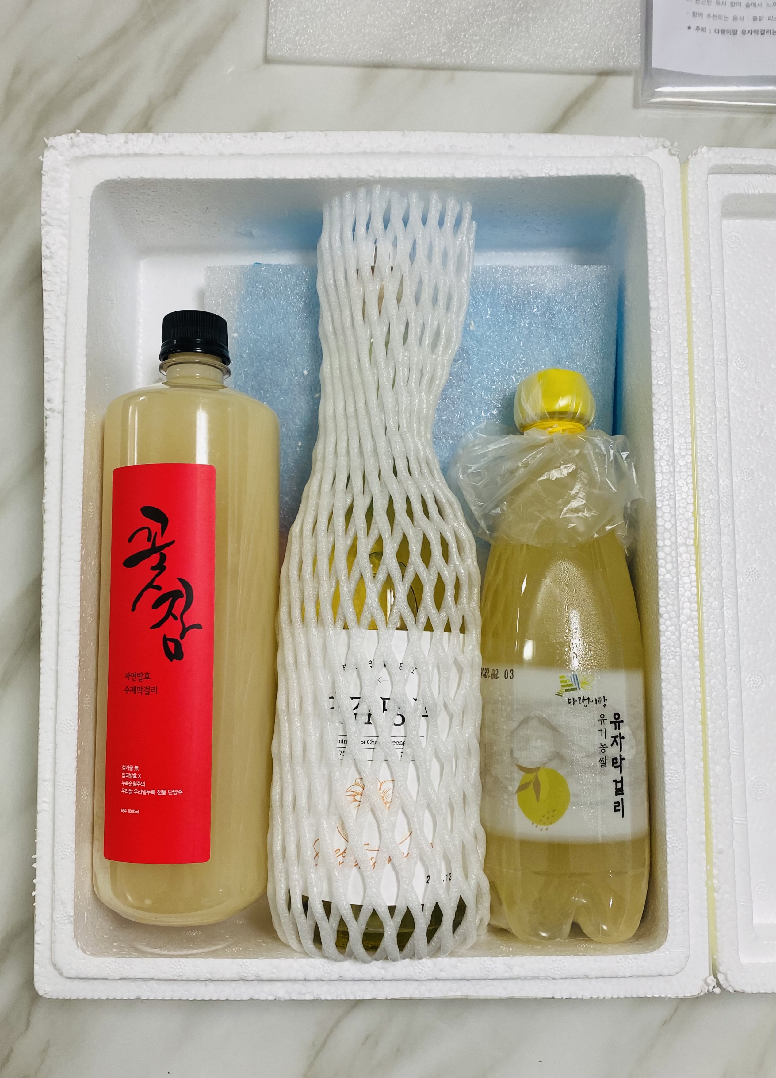 22년 1월은 다랭이팜 유자막걸리 750ml + 꽃잠 1,000ml + 단감명작 750ml + 우리술한잔 2월 매거진(매거진은 인쇄소 사정으로 A4에 인쇄돼서 왔습니다.)입니다.